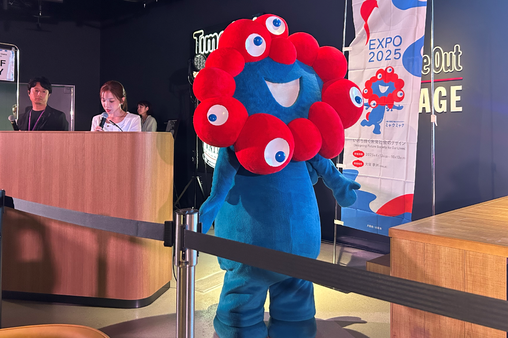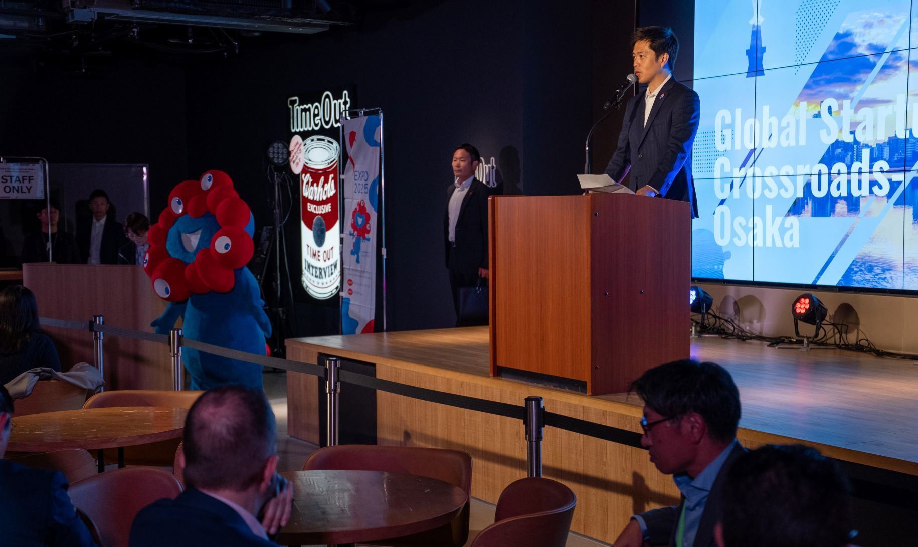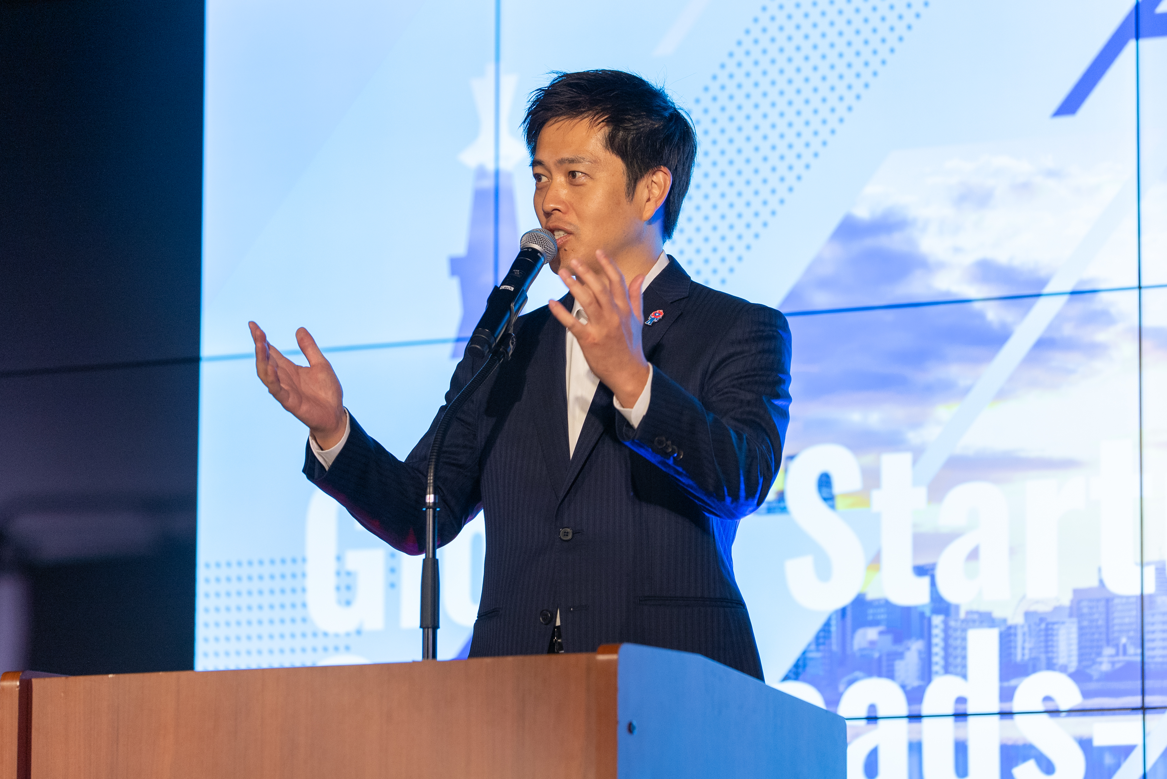 冒頭、主催者挨拶として吉村知事がミャクミャクとともに登壇されました。 吉村知事からはこのネットワークレセプションが新たな輪や共創の種となり、うめきたエリアをはじめ大阪が世界へイノベーションの波を広げていけるような存在となることを目指し、さらなる発展に取り組んでいく旨を述べられました。 ミャクミャクの登場で会場は大いに盛り上がり、スタートアップと大阪・関西万博の相乗効果への注目や期待感がさらに高まるきっかけとなりました。