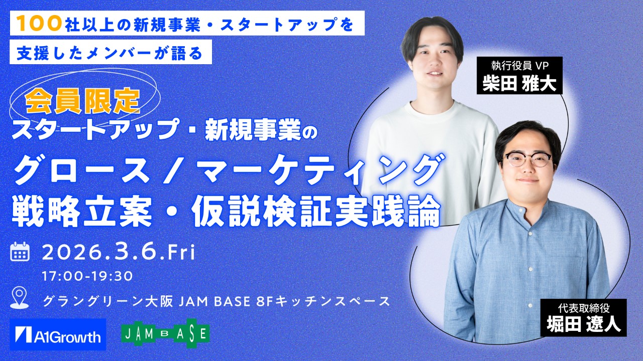「リリースしたけど売れない」 そんな課題に直面していませんか?それは製品の価値が顧客に正しく伝わっていないからかもしれません。 本勉強会では、100社以上の支援実績を持つ株式会社A1Growthが、「戦略、施策、体制、モデル」の4つの観点から、新規事業をグロースさせるための実践論をお話しします 。 参加企業の皆様同士の交流の時間も設けておりますので、ぜひご参加ください。 【日時】3月6日(金)17:00~19:30(懇親会含む) 【場所】グラングリーン大阪北館 JAM BASE8階 キッチンスペース 【参加費】無料