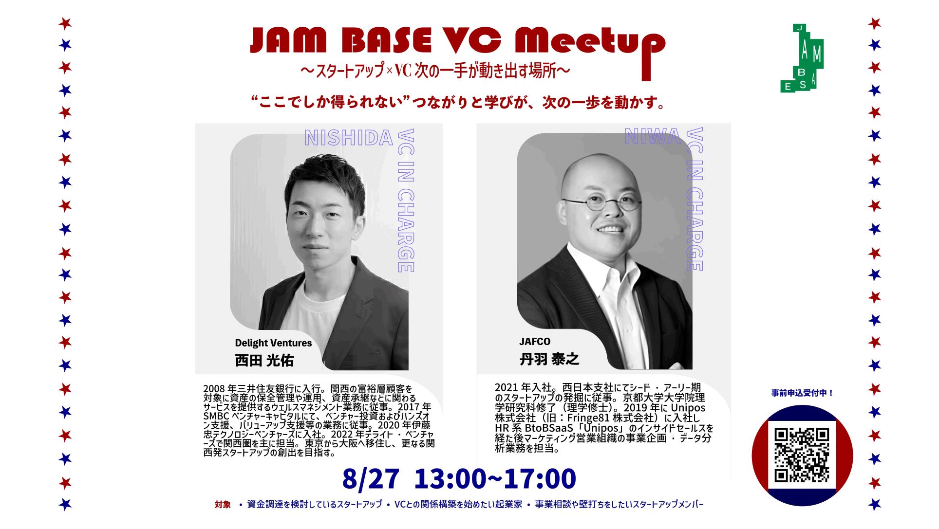 スタートアップとベンチャーキャピタル(VC)との接点を生み出す「JAM BASE VC Meetup」 この会では、JAM BASEに参画する(予定含)VCがスタートアップの成長に向けた悩みや資金調達、事業戦略について気軽に相談できる場を提供。リアルな視点でのフィードバックや資金調達に関するアドバイスを受けることが可能です。 事業フェーズ、JAM BASE内外を問わず幅広いスタートアップが対象となります。 日時:2025年8月27日 13:00~17:00 対象: • 資金調達を検討しているスタートアップ • VCとの関係構築を始めたい起業家 • 事業相談や壁打ちをしたいスタートアップメンバー 形式: • JAM BASE内にてリアル開催 • VCごとの相談ブース形式/事前予約制