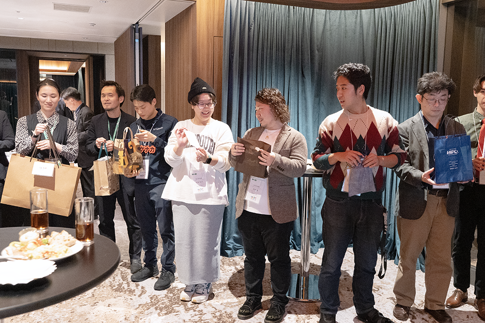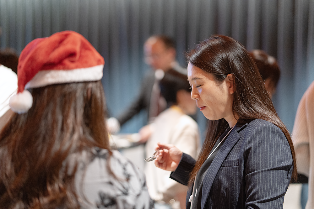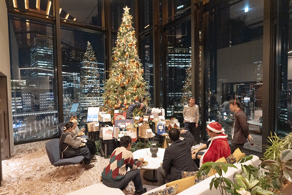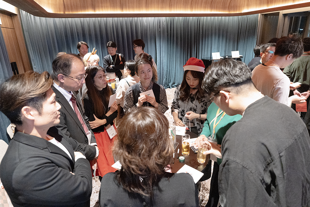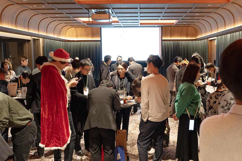 「JAMMING PARTY」は、JAM BASE会員のみなさまが月に一度集まり、交流を深めるイベントです。 JAM BASEで働く方々や関係者が集い、多彩なコンテンツや美味しい食事を楽しみながら意見交換や情報共有・ちょっとした本音トークまで、自由な雰囲気の中で気軽にコミュニケーションできる場となっています。 今回は「JAMMING PARTY#Xmas ver.」ということで、JAM BASEと同ビル内のキャノピーbyヒルトン大阪梅田10階にある宴会場「HIROMA」にて開催いたしました。 上質な空間で、クリスマスの特別感を楽しみながら交流を深められました。