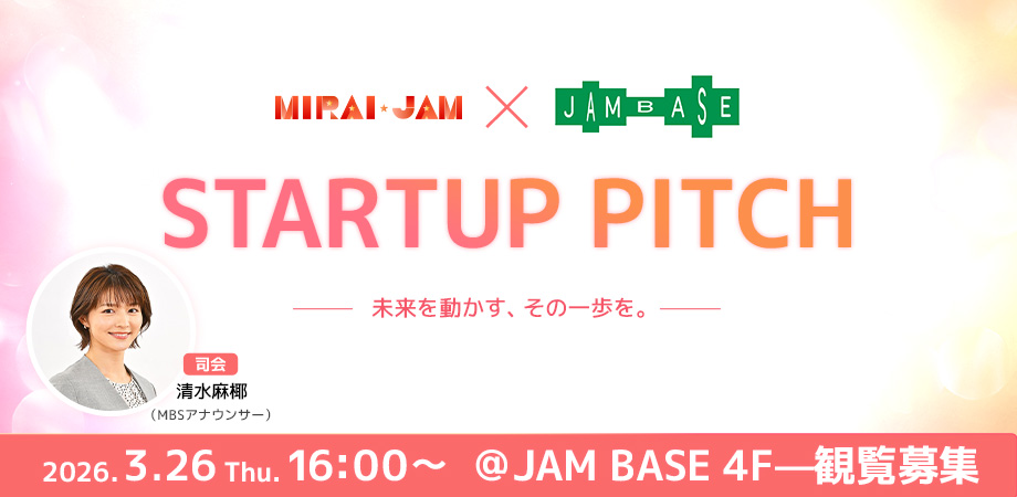 毎週土曜am6:00-6:30放送の起業家と未来のビジョンを語り合うMBSによるスタートアップ応援番組番組「MIRAI JAM」と、大阪梅田のイノベーション拠点「JAM BASE」がタッグを組み、スタートアップ企業限定のピッチコンテストを開催します! 次世代を担う起業家たちが、未来を変えるアイデアやビジネスプランを熱くプレゼンテーション。その瞬間を、ぜひ会場でご体感ください。