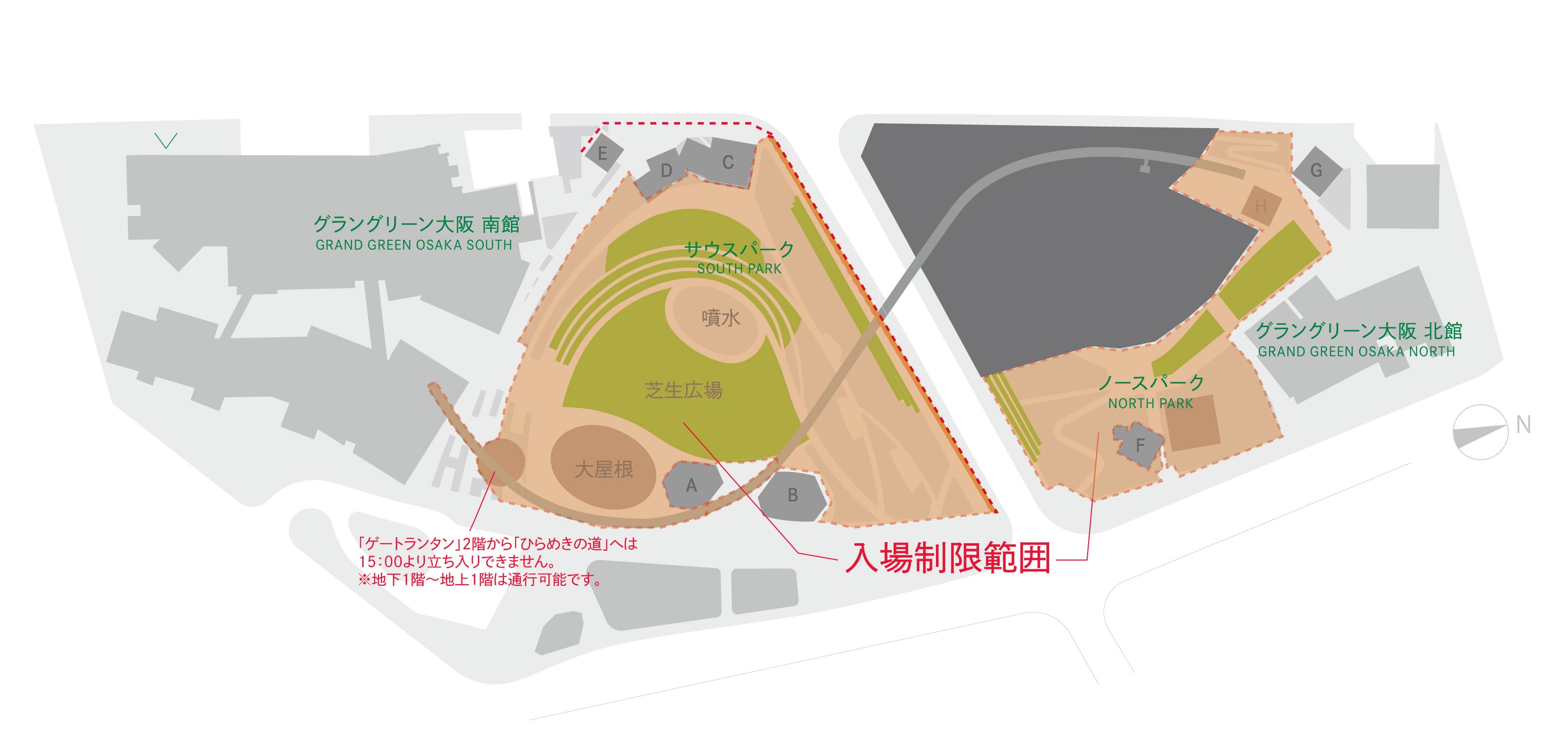 なにわ淀川花火大会及び周辺道路の交通規制に伴い、来園者の安全管理のため、10月18日(土)15:00より、うめきた公園を一時閉鎖させていただきます。 期間中は公園内への立ち入りはできません。 安全確保および円滑な運営のため、ご理解とご協力をお願いいたします。 ● 閉鎖時間 10月18日(土) 15:00 ~ 10月19日(日) 8:00頃 ※時間は予告なく変更になる場合がございます。 ※水盤は10月18日(土)終日水を抜き、噴水は停止しています。