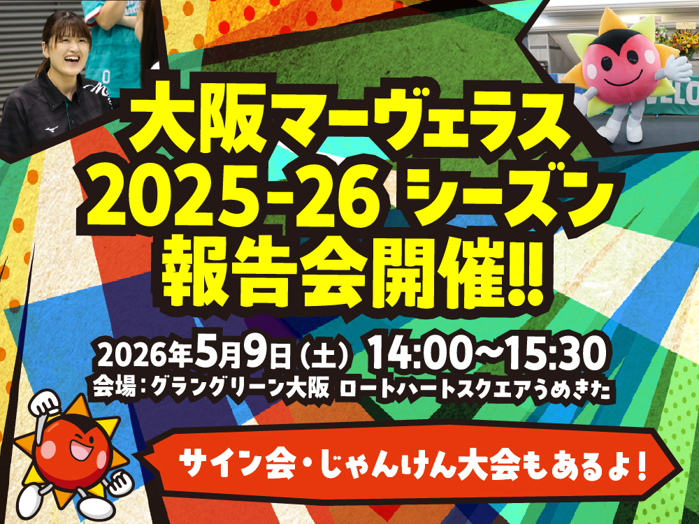 大阪マーヴェラスは、大阪市を拠点に国内トップリーグ「SVリーグ」で戦う女子バレーボールチームです。日頃より多くのファン皆さまに支えられながら活動しています。 このたび大阪マーヴェラスは、2025-26 大同生命SV.LEAGUE WOMENの活動を振り返り、皆さまへの感謝をお伝えする場として、ロートハートスクエアうめきたにてシーズン報告会を開催いたします。 当日は、監督・選手によるシーズンの振り返りや感謝のメッセージ、トーク形式での報告会を実施予定いたします。また、選手と交流できるイベントとして、じゃんけん大会やサイン会を行います。 さらに、会場内にはバレーボール体験エリアを設置し、サーブ体験や的当てなど、初めての方でも楽しめるコンテンツを用意します。チームマスコット「マーヴェりん」によるグリーティングや撮影会も実施し、ご家族でお楽しみいただける内容となっています。