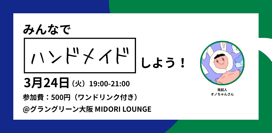 【日程】3月24日(火) 【時間】19:00~21:00 【場所】グラングリーン大阪 MIDORI LOUNGE 【参加費】500円(ワンドリンク付き) 【持ち物】自分が作業したいハンドメイド道具・材料 ※タイムスケジュールは変更になる可能性があります。 ※最新情報はうめきたPUBLIC SCOOP Instagramで発信予定。
