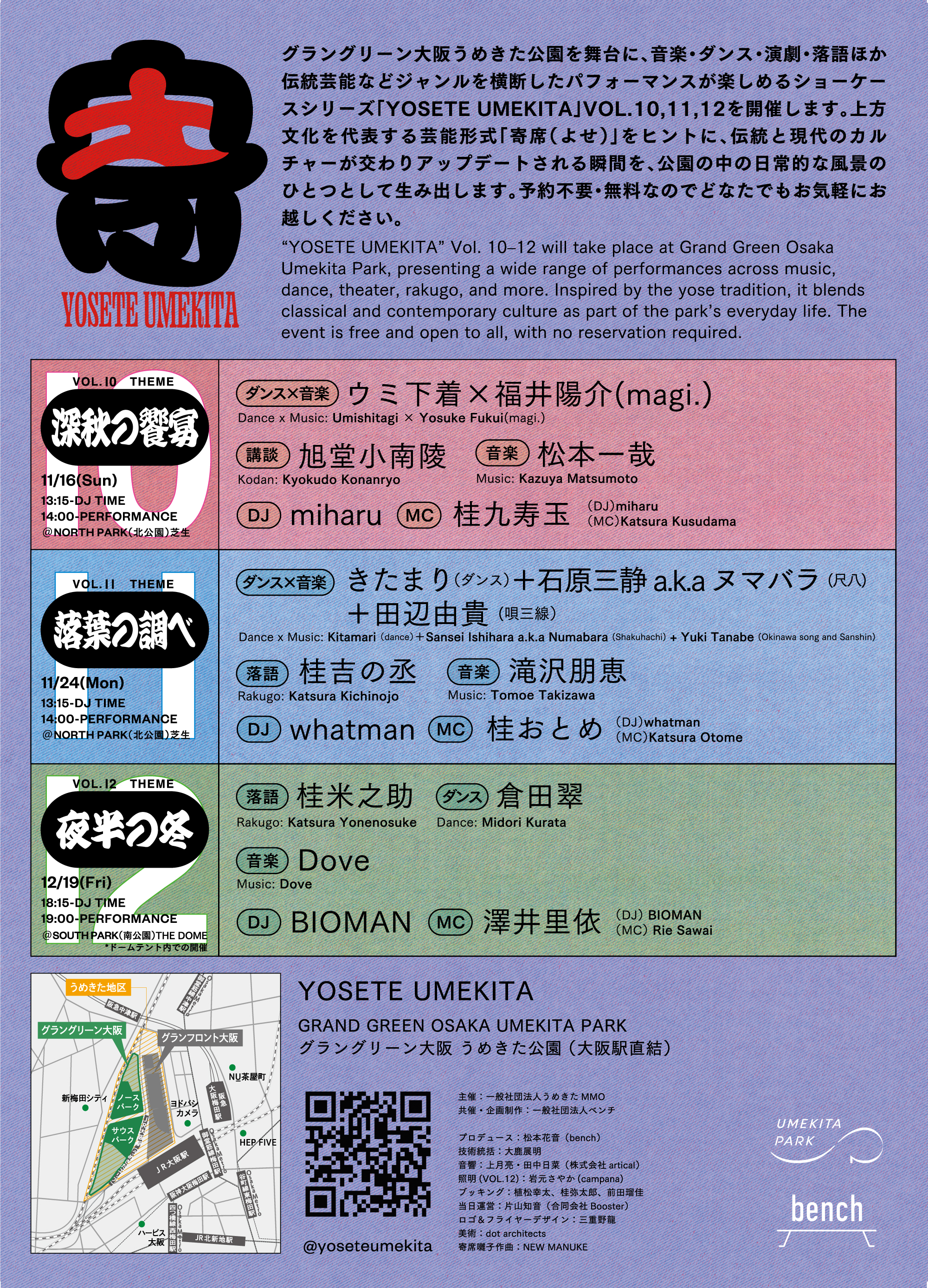 グラングリーン大阪うめきた公園を舞台に、音楽・ダンス・演劇・落語ほか伝統芸能などジャンルを横断したパフォーマンスが楽しめるショーケースシリーズ「YOSETE UMEKITA」VOL.10から12までの開催が決定しました!上方文化を代表する芸能形式「寄席(よせ)」をヒントに、伝統と現代のカルチャーが交わりアップデートされる瞬間を、公園の中の日常的な風景のひとつとして生み出します。予約不要・無料なのでどなたでもお気軽にお越しください。 詳細・最新情報はInstagram @yoseteumekita でお知らせします。