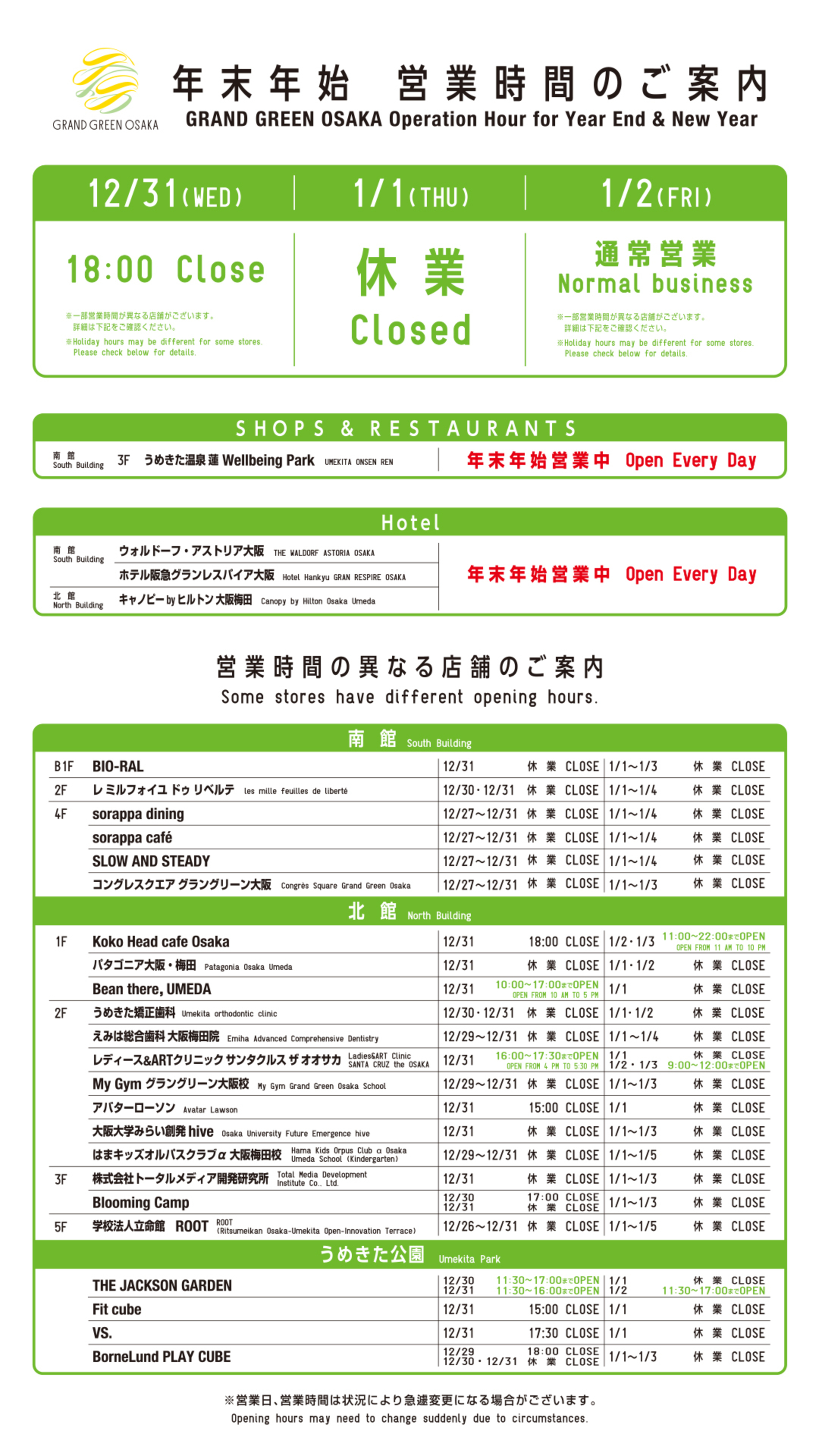 【年末年始】グラングリーン大阪 営業時間のお知らせ