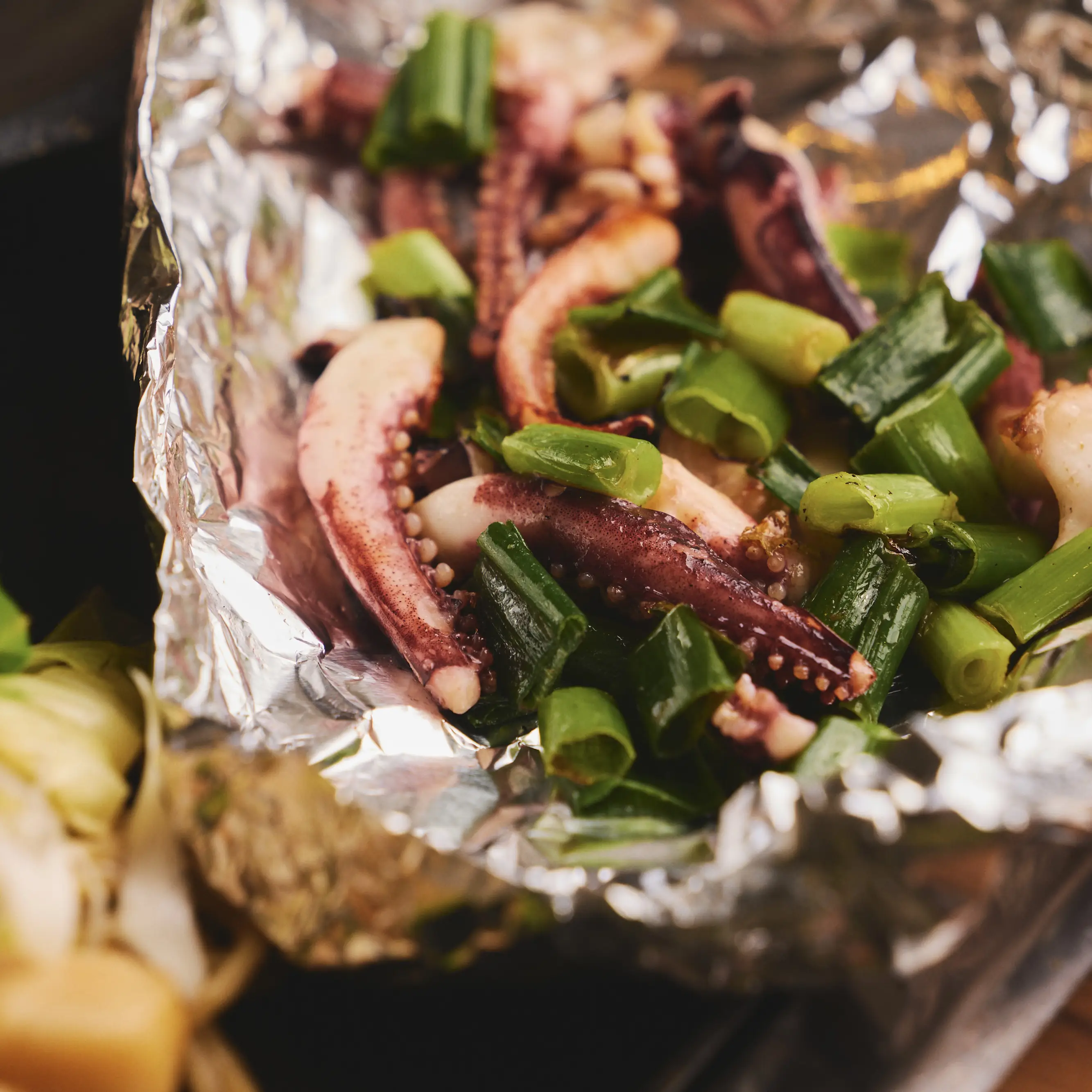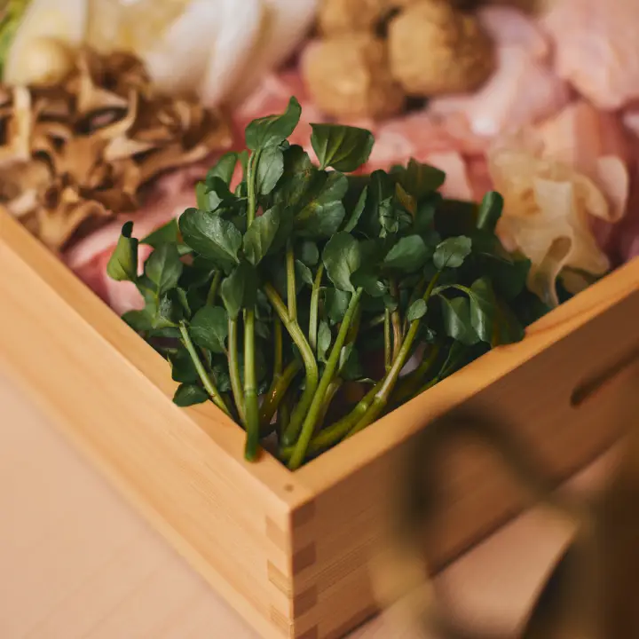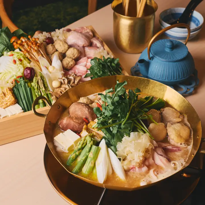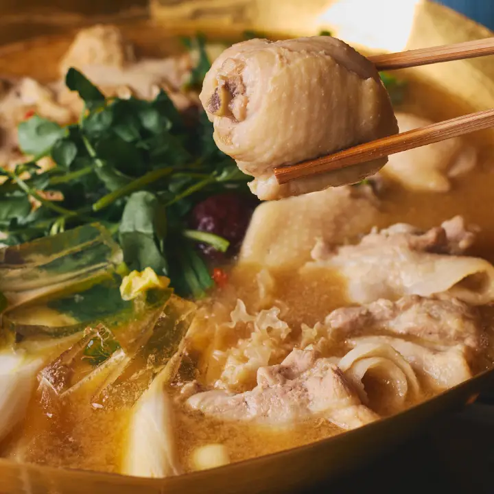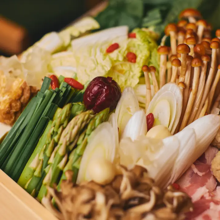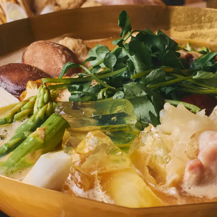 鶏もも肉、豚肉、つくね、手羽先、白菜、きのこ、コラーゲン、ほうれん草、クレソン、ニラ、ブラウンエノキ、ネギ、豆腐、アスパラガス、白キクラゲ- 写真は4名様分