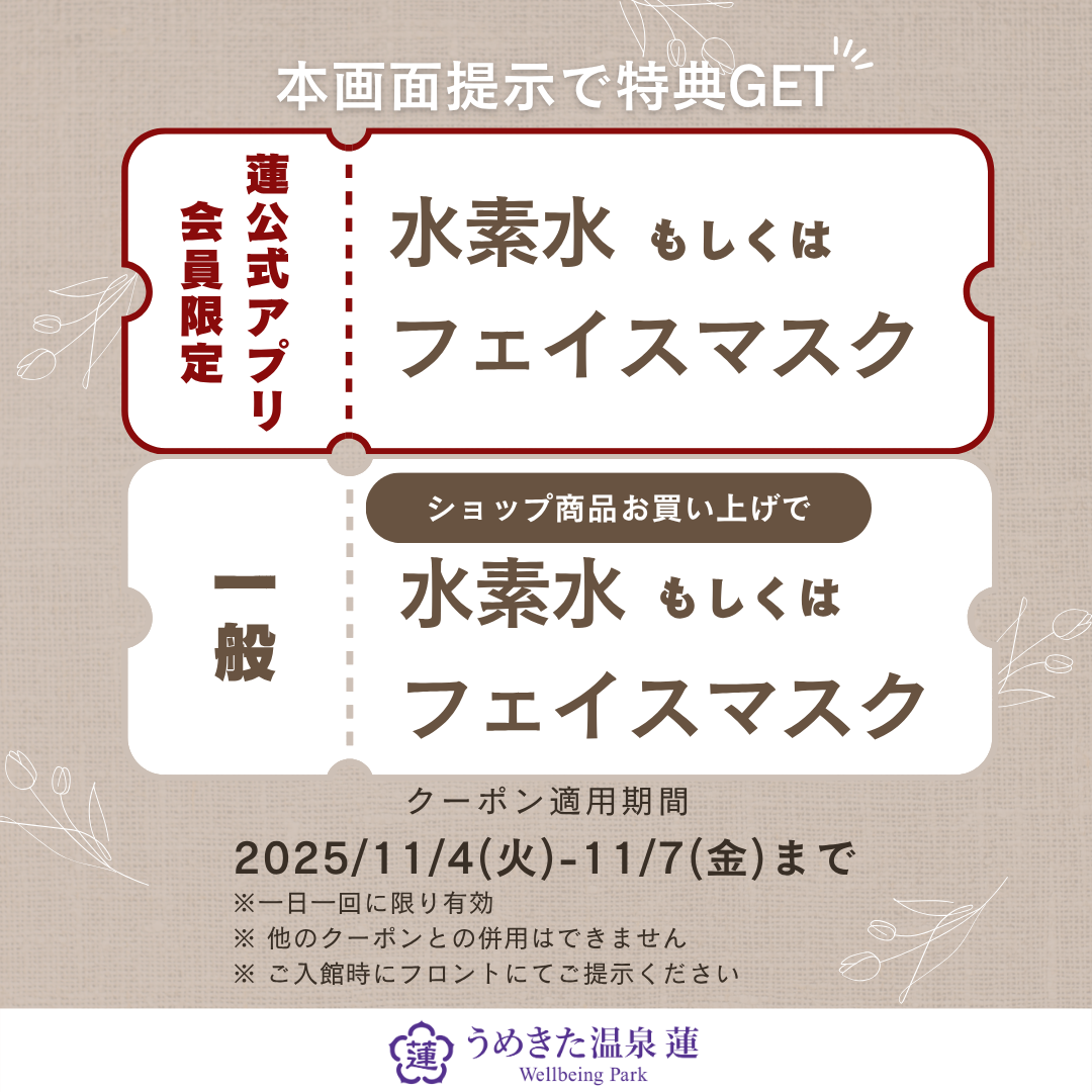 蓮公式アプリ会員限定:水素水もしくはフェイスマスクプレゼント🎁 ※当日アプリ会員登録していただいた方も対象 一般:<ショップ商品お買い上げで>水素水もしくはフェイスマスクプレゼント🎁