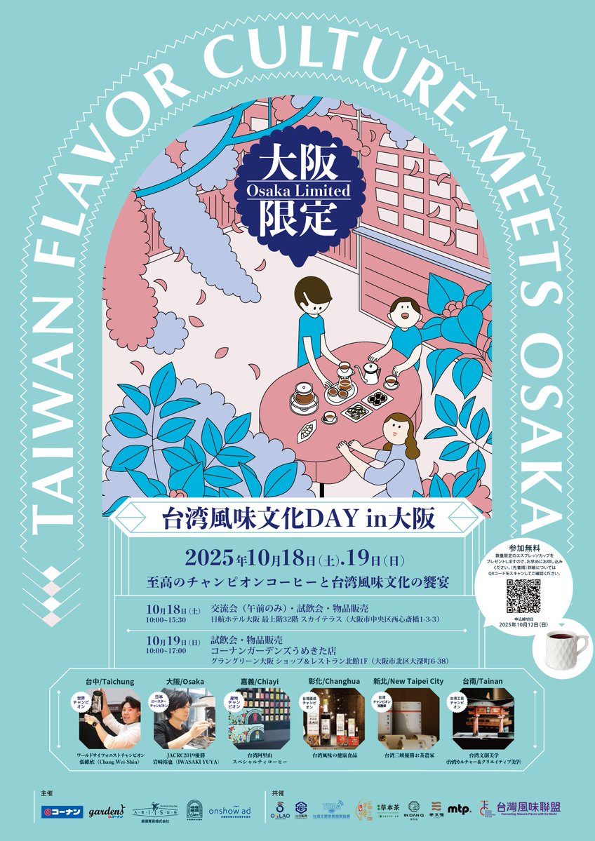 阿里山スペシャルティコーヒーをはじめ、台湾のお茶や文化創作品など、多彩な魅力に触れられる2日間のイベントです。1日目10/18(土)の会場は大阪日航ホテルにて、10/19(日)はgardens umekitaを会場として試飲会と物品販売のイベントが開催されます。世界サイフォンチャンピオン・張維(Chang Wei-Shin)氏、JAC Roast Competition(JACRCチャンピオン・岩崎裕也(Iwasaki Yuya)氏を迎え、台湾と日本のトップバリスタ・ロースターによる“日台チャンピオン共演”を実現します。