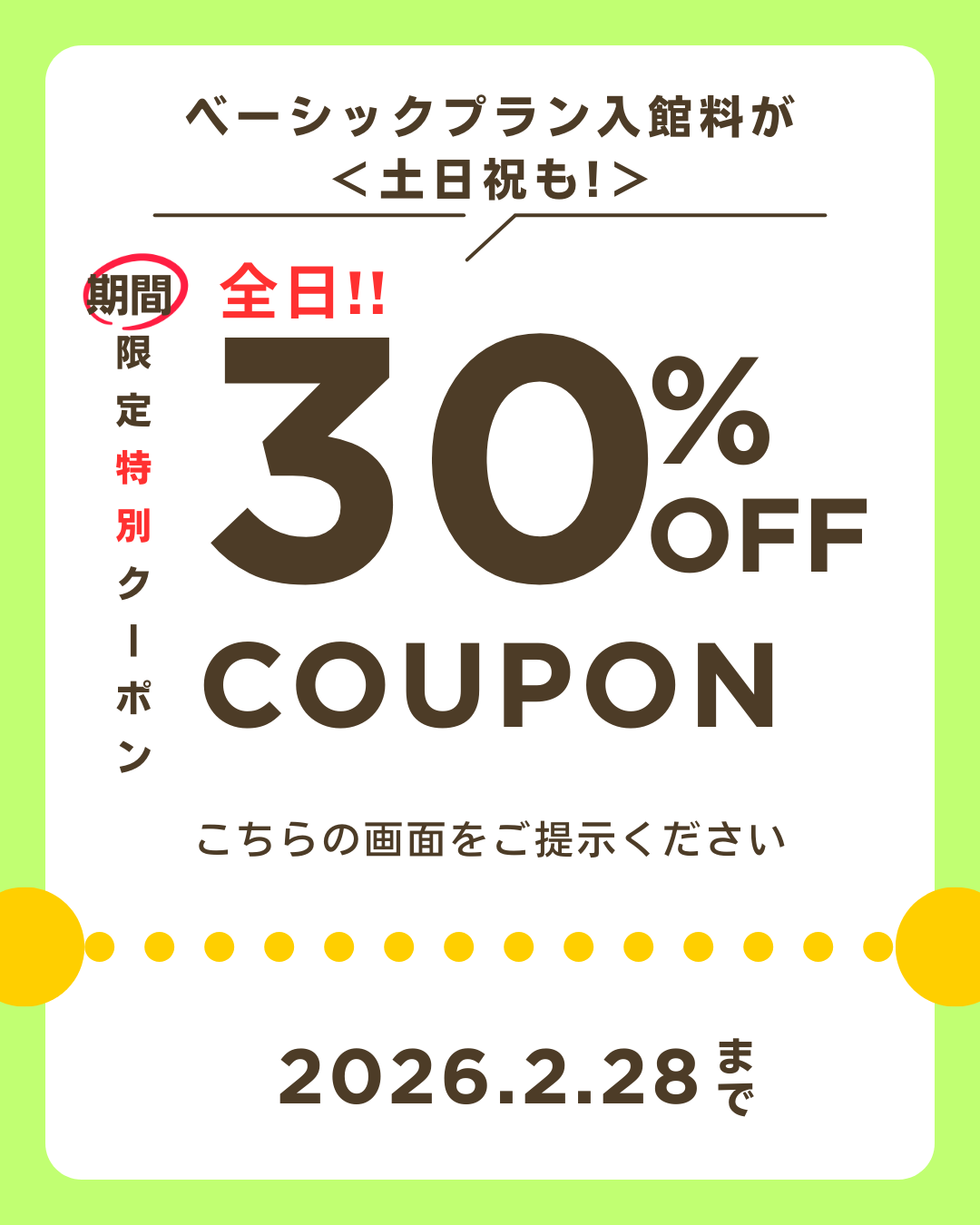 ※刺青・タトゥーのある方のご入館はお断りしております。 ※施設のご利用は12歳以上に限らせていただいております。なお、18歳未満のお客様のご利用については、18歳以上(高校生は除きます)の方の同伴が必要です。 ※他の割引、特典との併用はできません。 ※施設が定める特定日(年末年始・GW・お盆など)は土日祝料金を申し受けます。 ※ご入館時に必ずクーポン画面をご提示ください。ご入館後にご提示いただいた場合はご利用できません。 ※諸事情により有効期限内に掲載を終了する場合がございます。