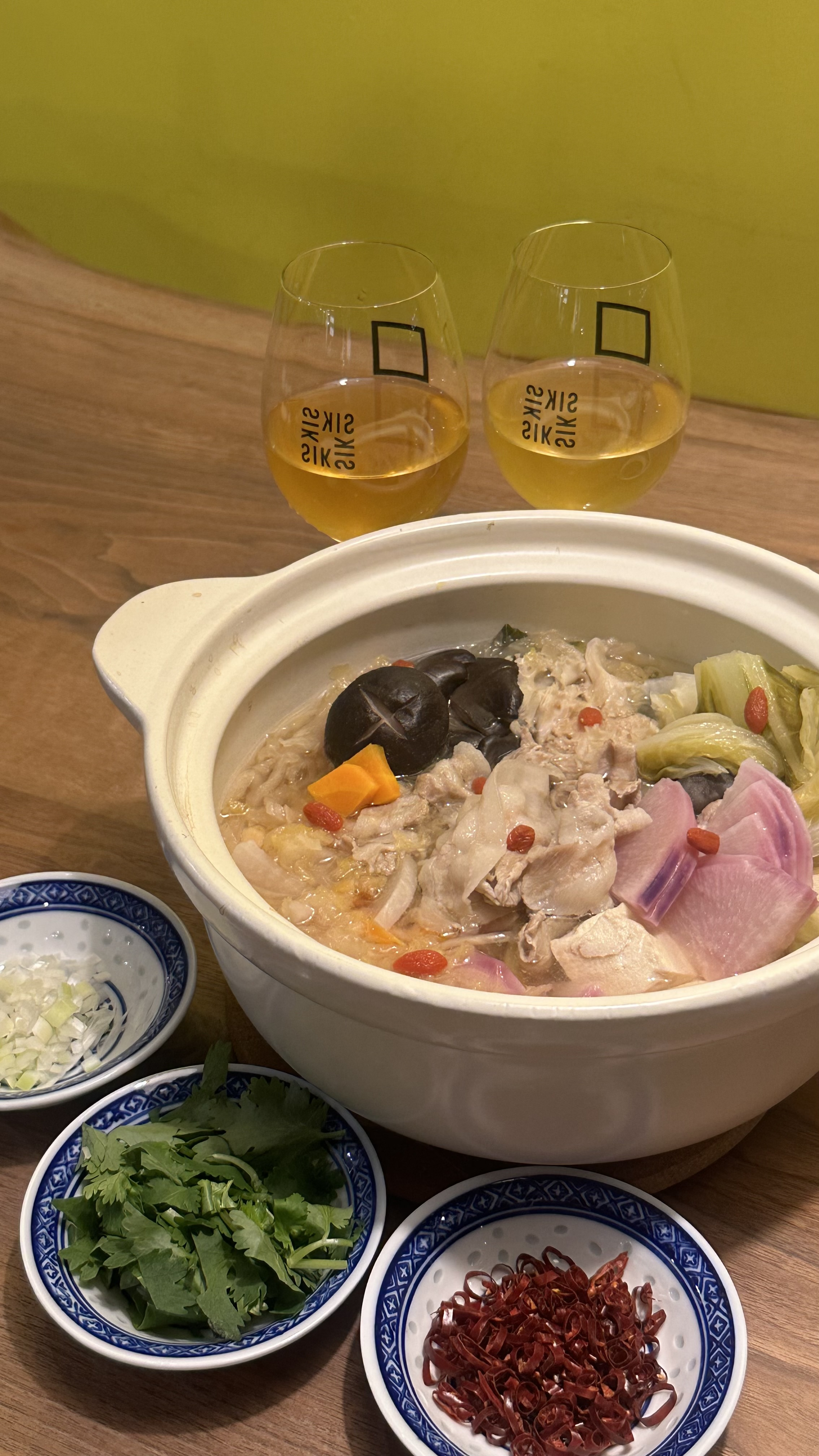 乳酸発酵させた白菜のやさしい酸味と旨み。甘みが強く、脂が軽い薩摩茶美豚を合わせ、野菜ときのこの滋味を引き出しました。 食べ進めるほどに味わいが深まる、体にやさしい季節の鍋です。
