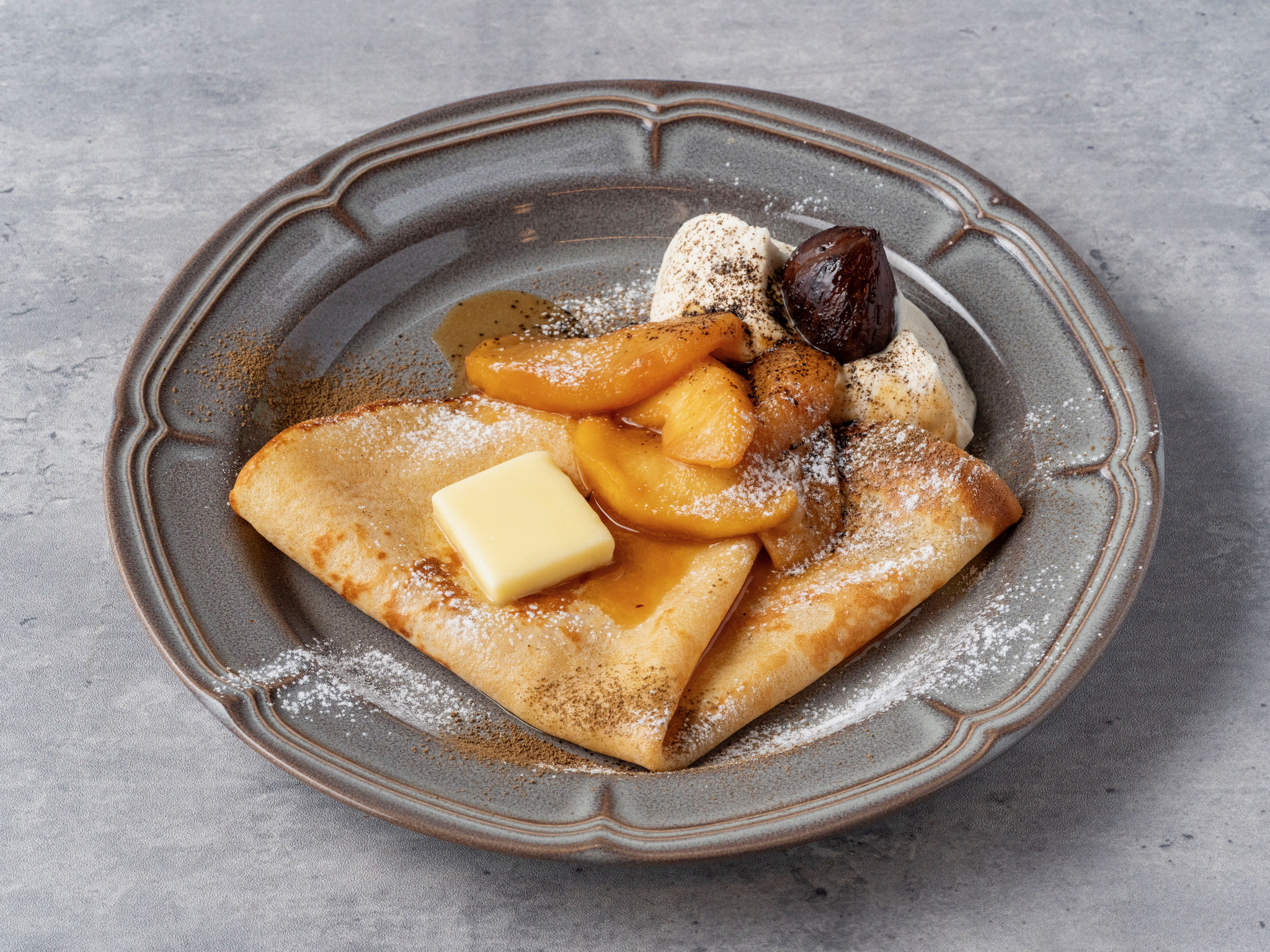 ほろ苦く煮た青森県木村りんご園のりんごと、和栗のクリームをたっぷりと乗せました。ほうじ茶の香りがより一層冬を感じさせるクレープです。 価格:1,320円(税込)