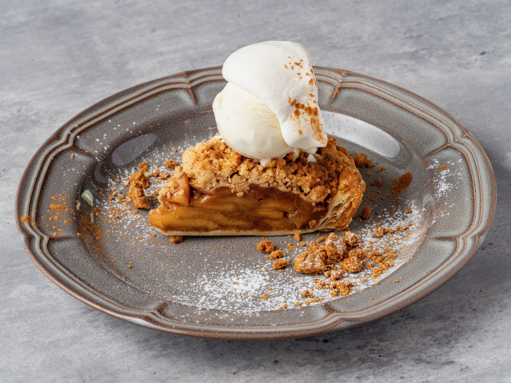 ほろ苦く煮た青森県木村りんご園のりんごを贅沢に使ったアップルパイです。上にはザクザクのクランブルを乗せ食感をプラス。バニラアイスと共に熱々をお召し上がりください。 価格:850円(税込)