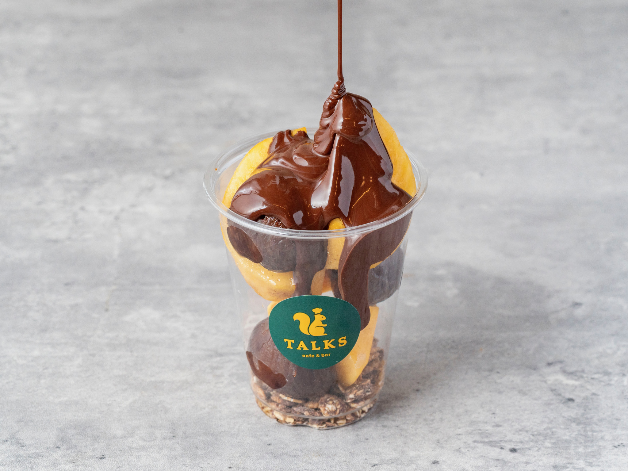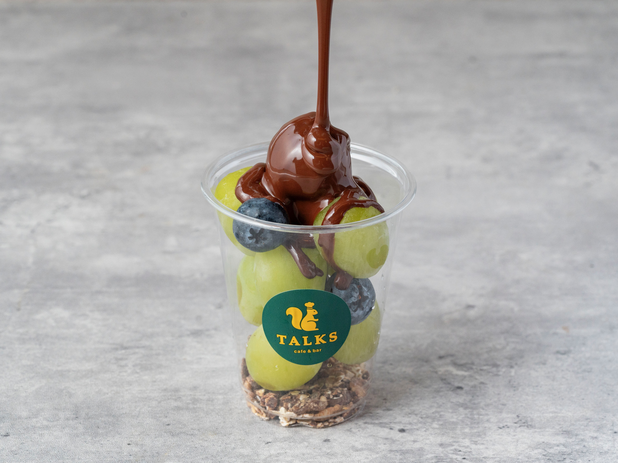 旬のシャインマスカットの上から、カカオ70%のTALKSオリジナルチョコレートをたっぷりかけたシンプルで贅沢なデザート。チョコグラノーラがアクセントです。【Vegan】 価格:1,150円(税込)