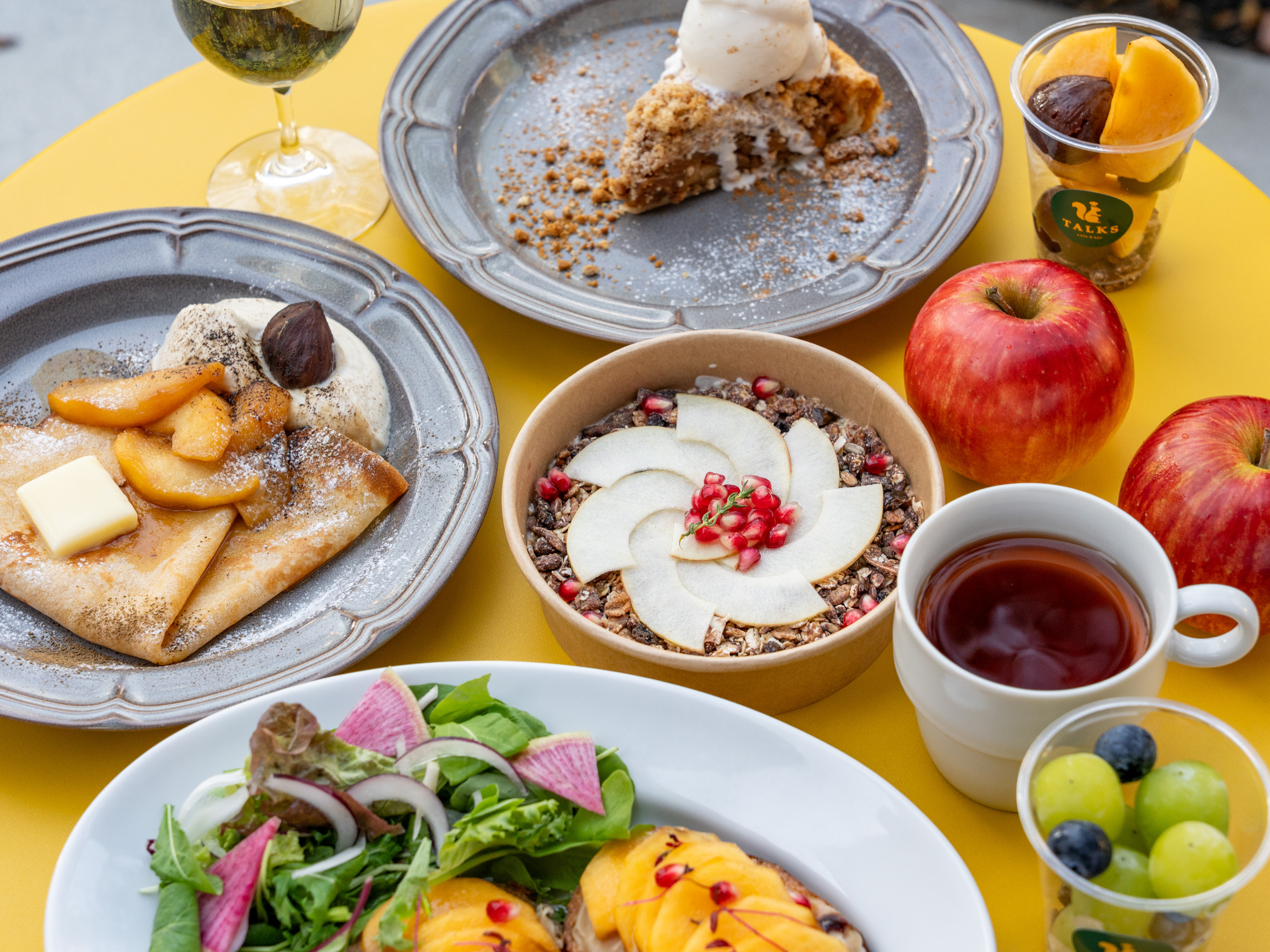 2025年11月1日(土)より、TALKS cafe & barおよび系列店にて、秋の終わりから冬にかけて旬のフルーツを使用した「WINTER FAIR 2025」を開催いたします。 青森県の契約農家「木村りんご園」による環境にやさしい栽培で育ったりんごをはじめ、旬の柿やマスカット、栗などを使った料理やスイーツをぜひお楽しみください。