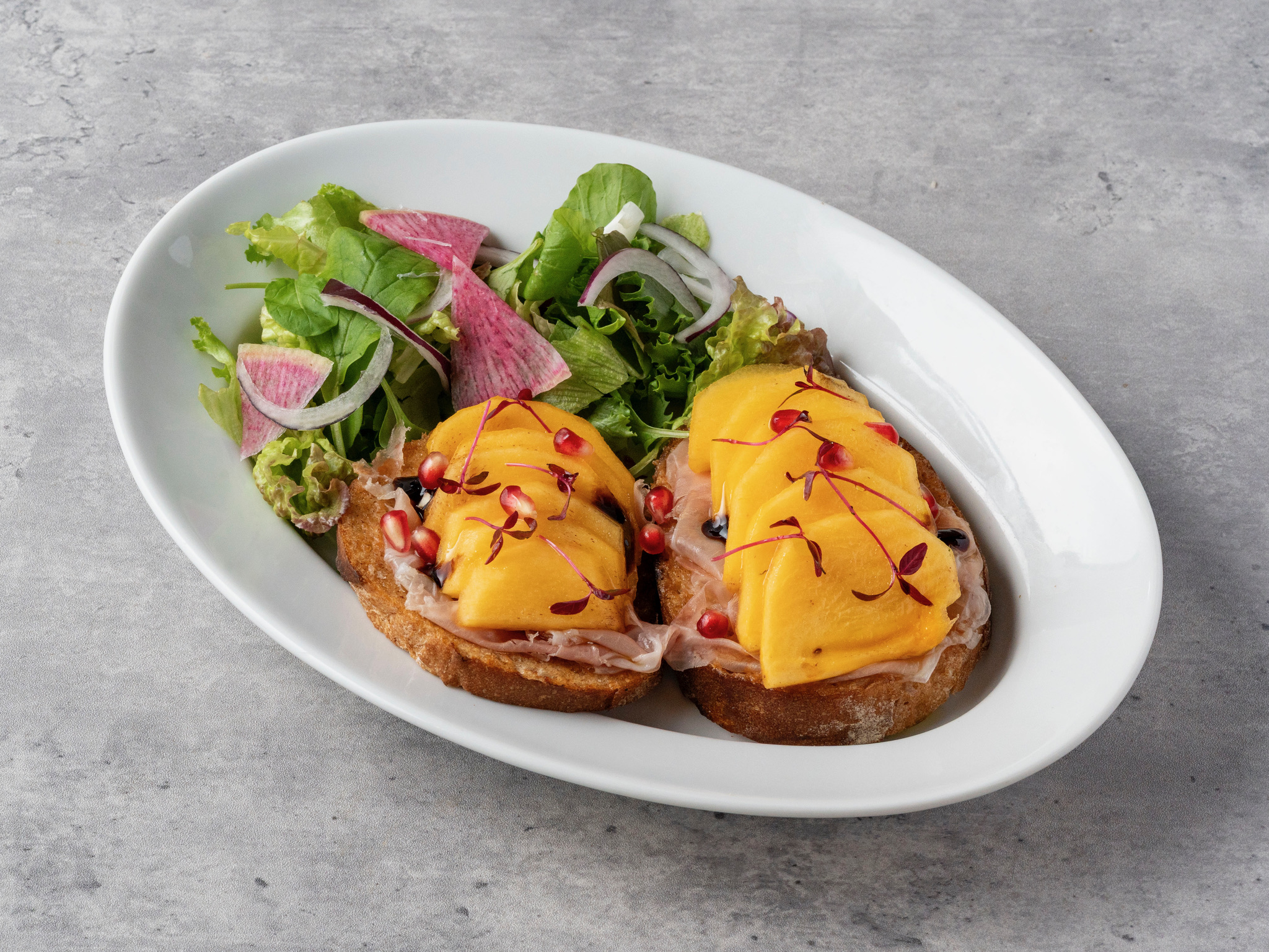 柿のチャツネとサワークリームを混ぜ込んだ、柿バターを塗ってカンパーニュをトーストしました。少し厚めにカットした柿のジューシーさと生ハムの塩味が絶妙です。 価格:1,380円(税込)