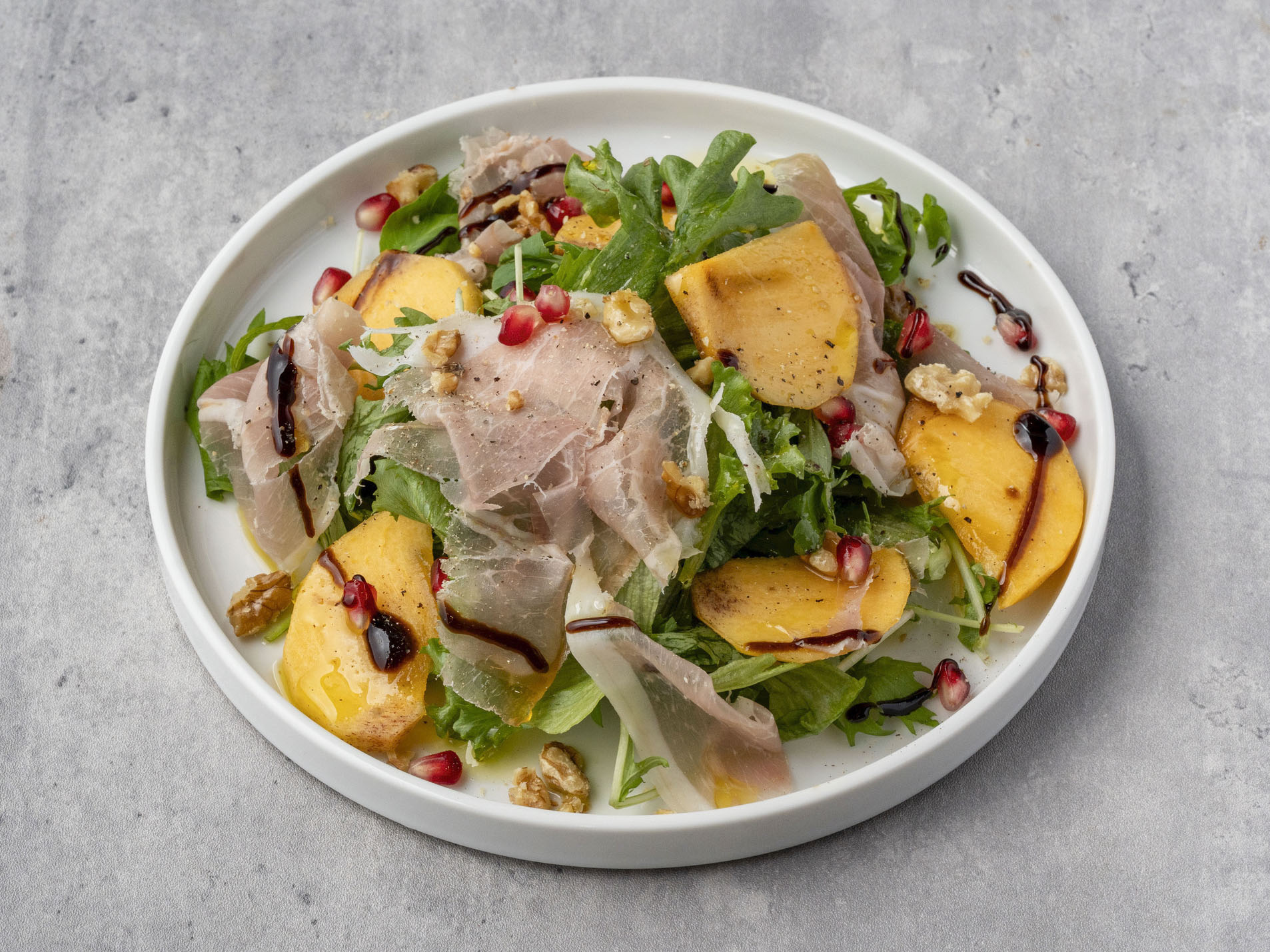 甘い柿と生ハムの塩気が好相性。ザクロとくるみのアクセントと食感を添える、爽やかなサラダです。 価格:880円(税込)