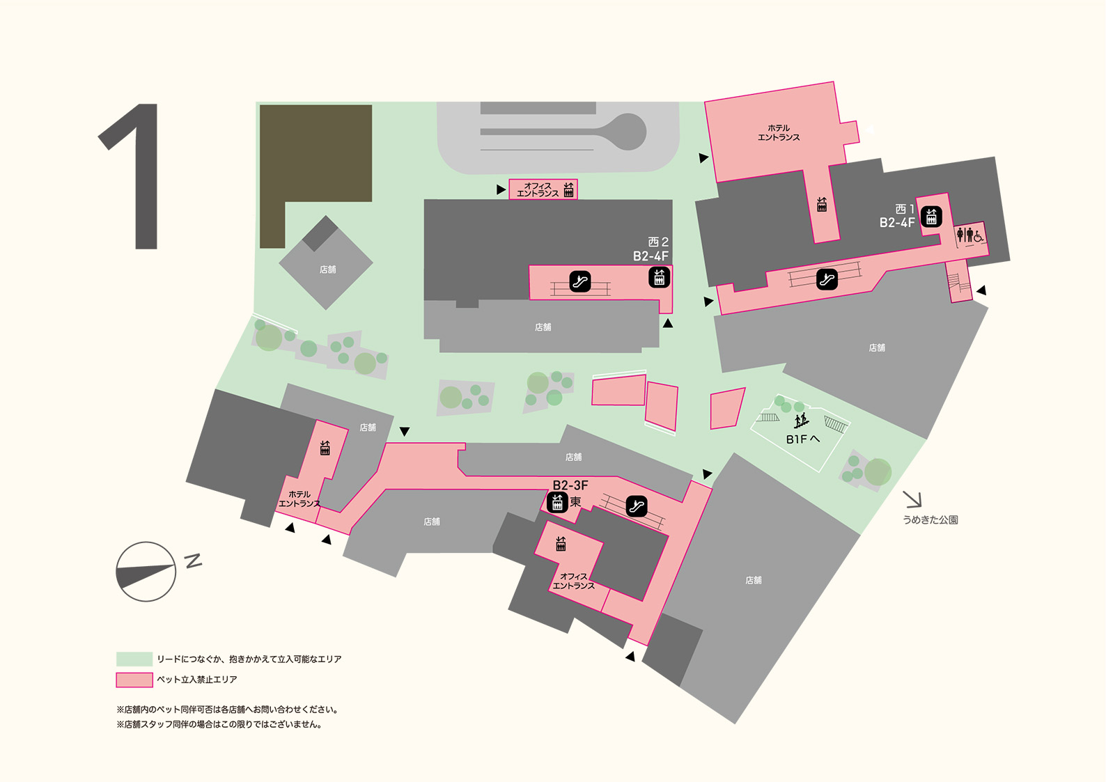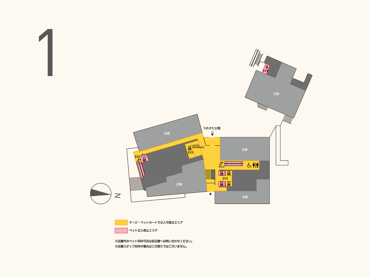 - 盲導⽝、介助⽝、聴導⽝は、全てのエリアで同伴いただけます。ただし、セラピー⽝は⼀般のペット同伴ルールに準じます。